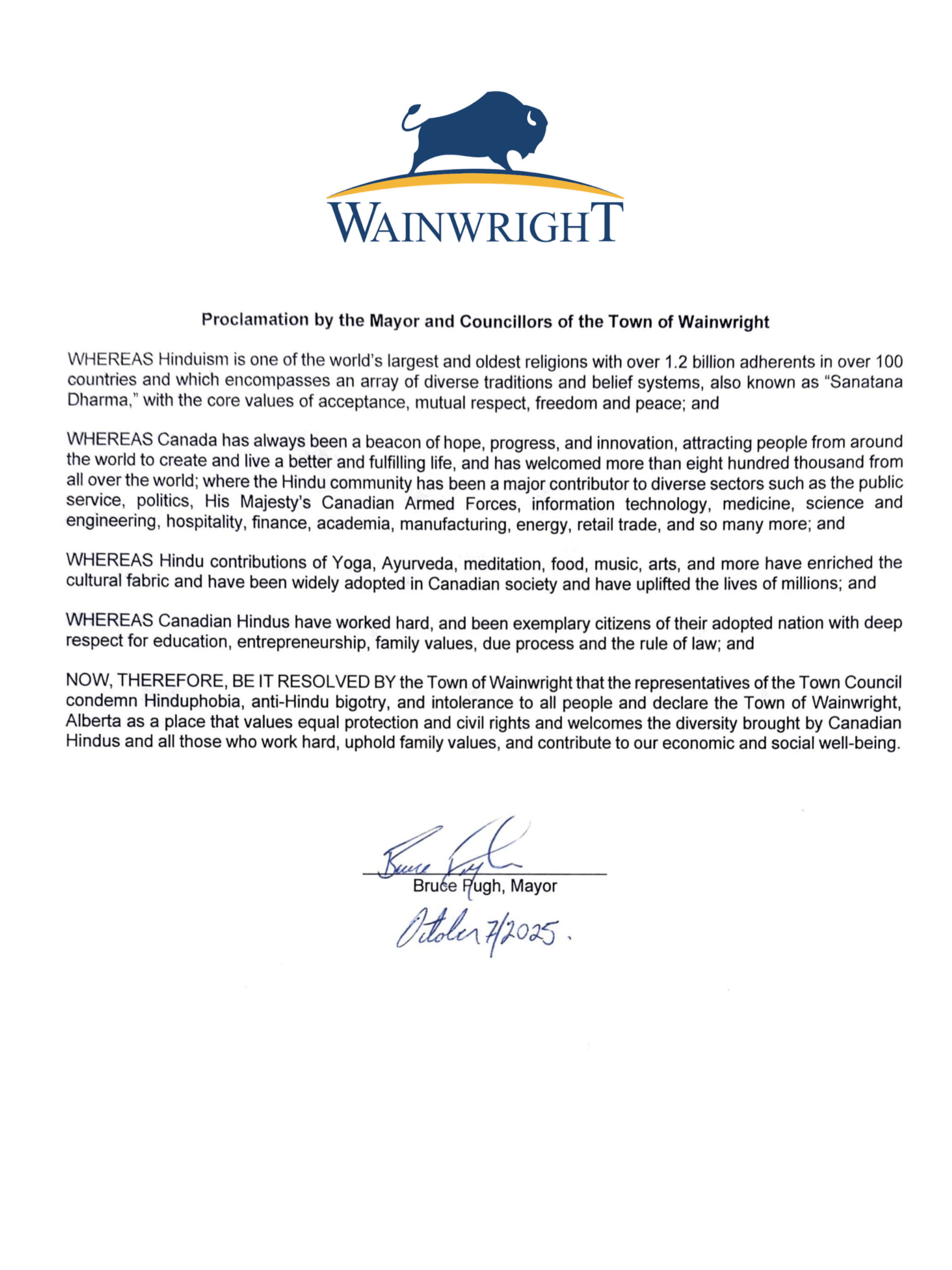 WAINWRIGHT, ALBERTA, CANADA, October 8, 2025 /EINPresswire.com/ — The Coalition of Hindus of North America (CoHNA) welcomes the historic proclamation by the Town of Wainwright, Alberta, which has become the first municipality in Canada to formally condemn Hinduphobia and anti-Hindu bigotry. This groundbreaking declaration addresses anti-Hindu discrimination and intolerance while reaffirming the community’s commitment to diversity, equal protection, and civil rights.