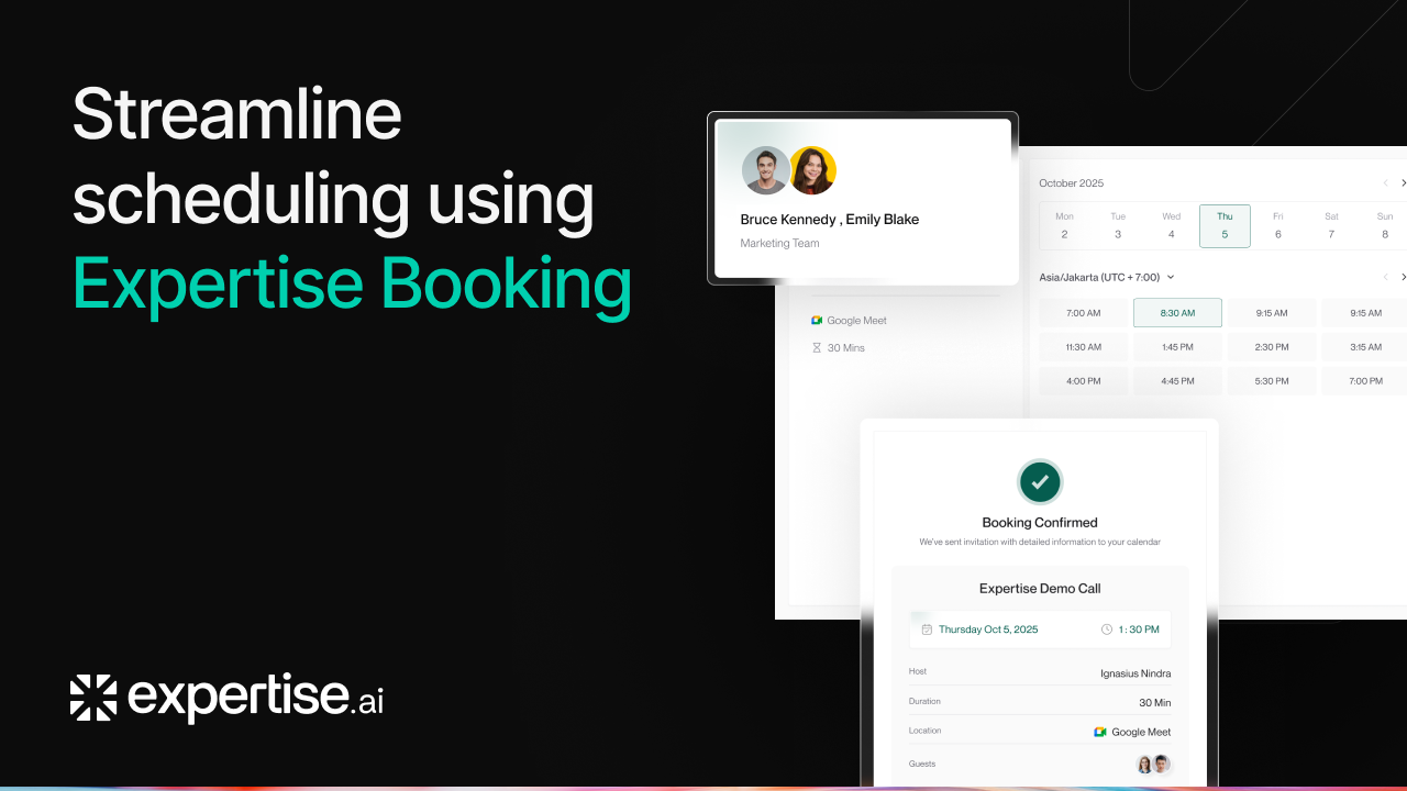 TORONTO, ONTARIO, CANADA, October 14, 2025 /EINPresswire.com/ — Expertise AI, an innovator in AI-powered sales engagement and productivity tools, today announced the launch of Expertise Booking, a powerful and intuitive scheduling tool designed to simplify how meetings are booked both individually and at scale across teams.