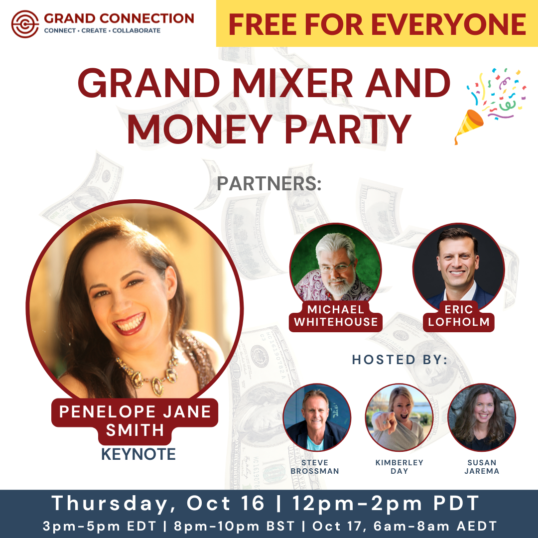 VANCOUVER, CANADA, October 15, 2025 /EINPresswire.com/ — In an era defined by artificial intelligence, automation, and constant change, entrepreneurs are realizing that trust, authenticity, and collaboration are the true currencies of sustainable success. To support small business owners navigating this shift, three communities are coming together for the Grand Connection “Money Party,” a free virtual event on Thursday, October 16, 2025, from 12:00 pm to 2:00 pm PDT.