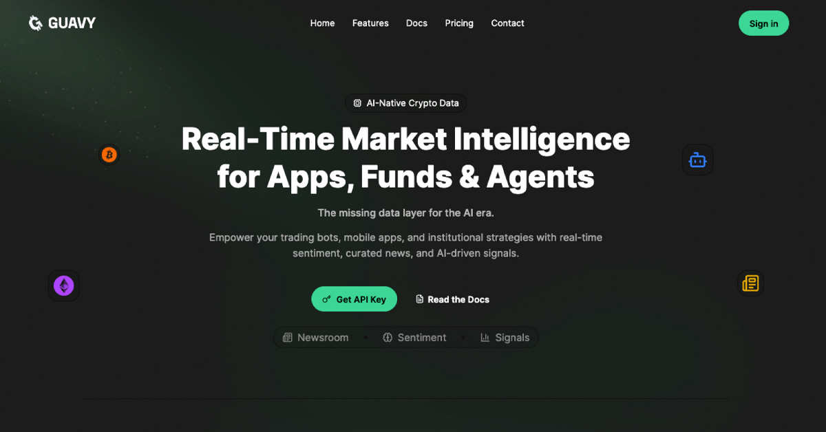 CALGARY, ALBERTA, CANADA, January 8, 2026 /EINPresswire.com/ — Guavy (www.guavy.com) today announced the public launch of its AI-native API platform (https://data.guavy.com), providing developers, quantitative teams, funds, and AI agents with real-time cryptocurrency market intelligence. The platform delivers real-time sentiment analysis, trend signals, and curated news across 350+ digital assets through a simple REST API designed specifically for the AI era.
