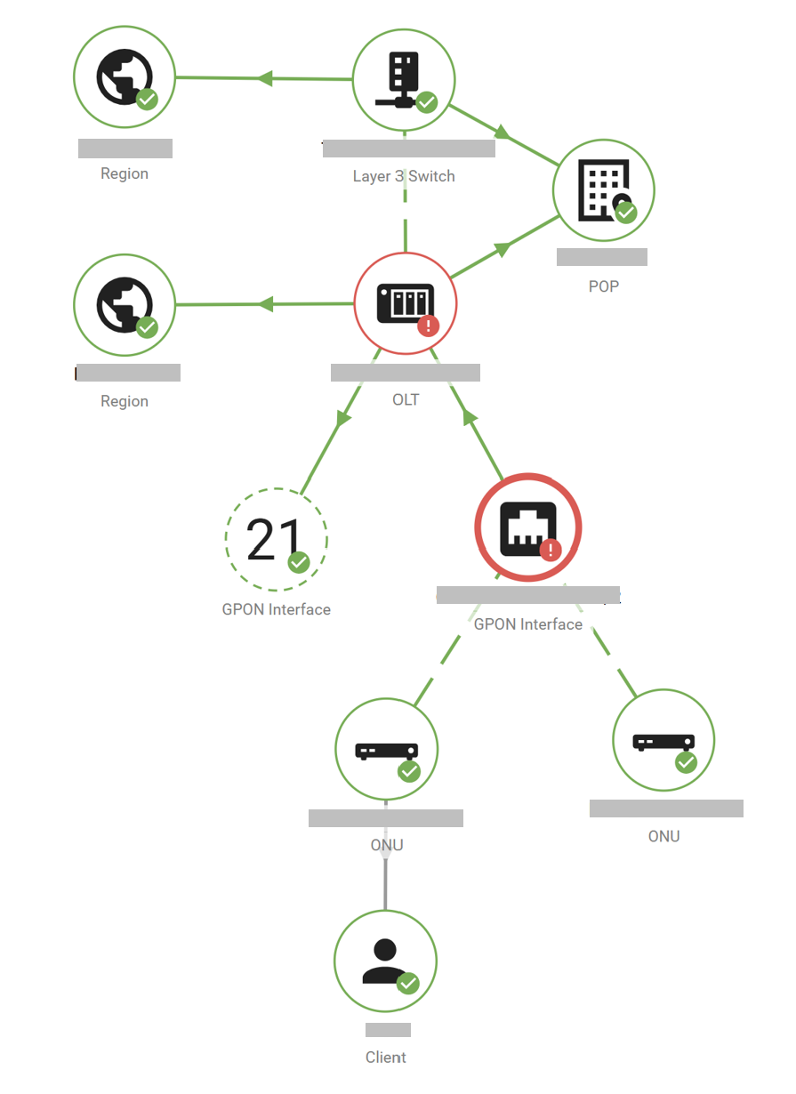 – Dynamic Topology Reconstruction: The platform automatically builds a live dependency graph linking physical entities (Metro → OLT → Splitter → ONT) to logical customer services and SLA commitments.