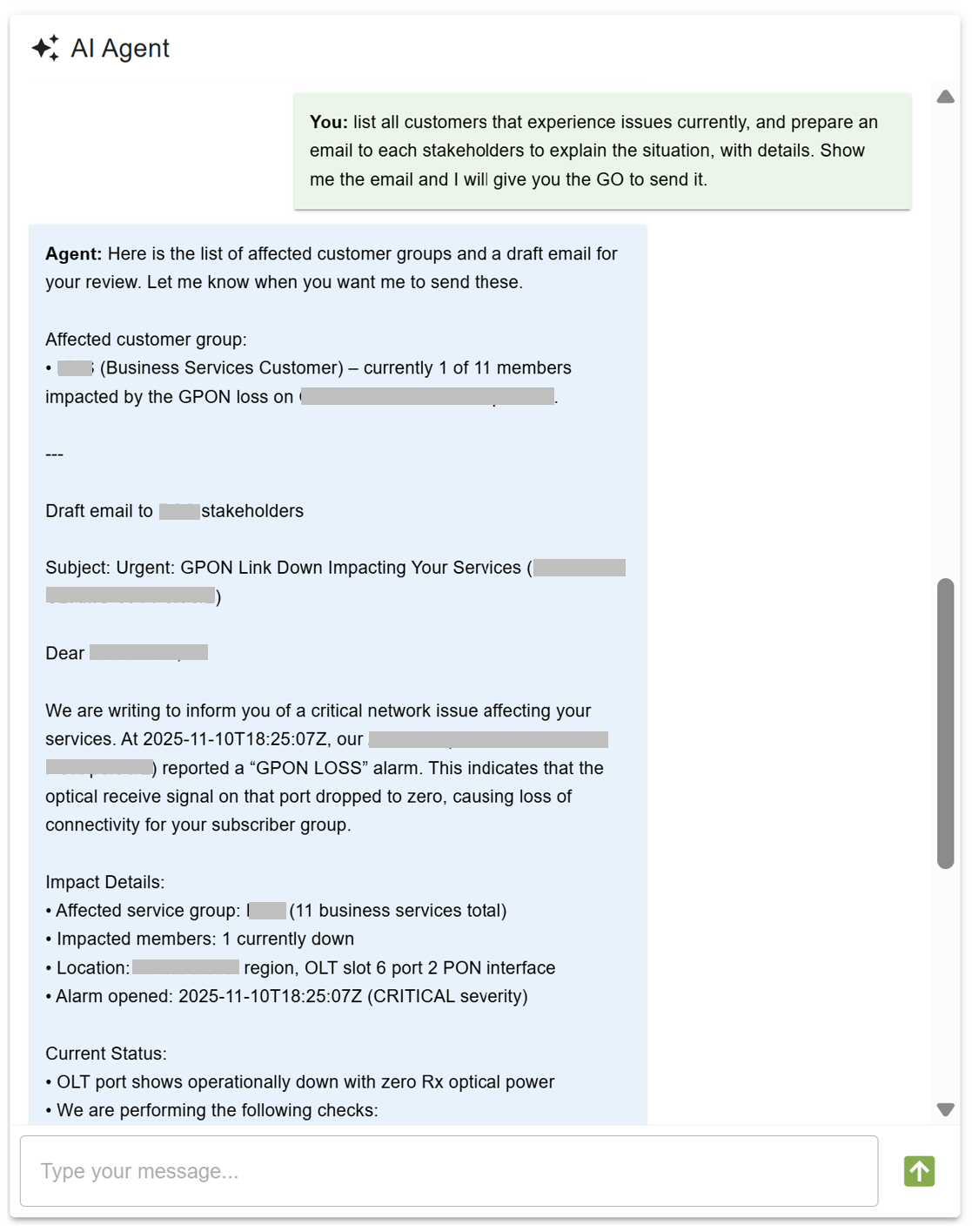 – Conversational Diagnostics: Technicians can interact with the network via a context-aware chat interface. Instead of navigating dashboards, they can ask, “Identify all customers affected by the attenuation spike on splitter Z,” and receive a structured explanation backed by live evidence.