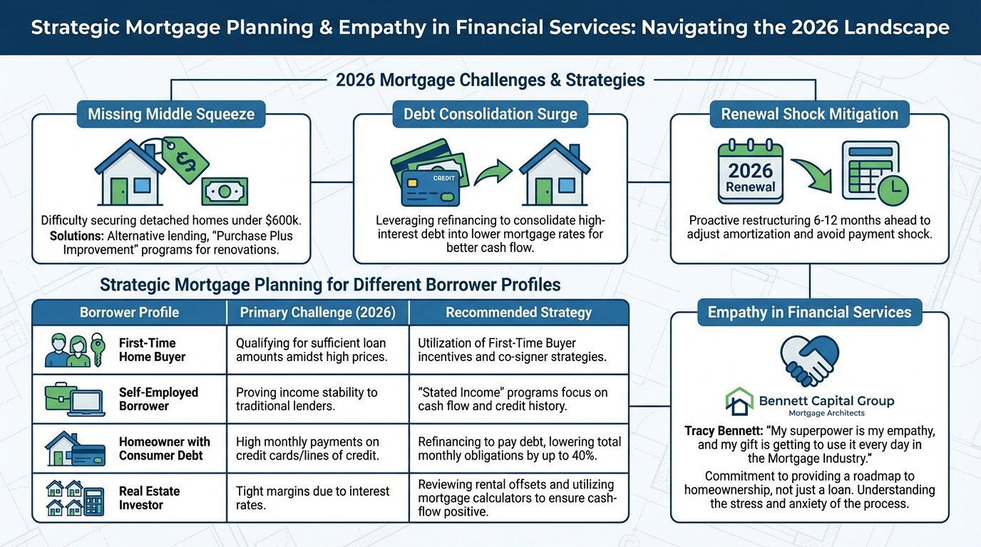 Renewal Shock Mitigation: Homeowners who purchased at the peak of low rates are facing renewals in 2026. Bennett Capital Group from Mortgage Architects is actively working with these clients 6 to 12 months in advance to restructure amortization and avoid payment shock.