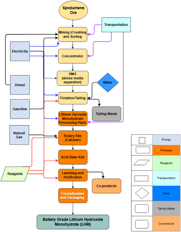 Such regional specificity made it possible to identify emission hotspots relevant to the North American EV battery ecosystem. For instance, considering that energy consumption (electricity, diesel, gasoline, and natural gas), water usage, and transportation accounted for the main environmental impacts of LiOH•H2O production, the authors suggested that replacing fossil fuel vehicles with their EV counterparts and electrifying the process calciner and mining equipment (excavators, dump trucks, graders, etc.) with renewable hydroelectric power could have a disproportionate impact on CO2e emissions mitigation efforts.