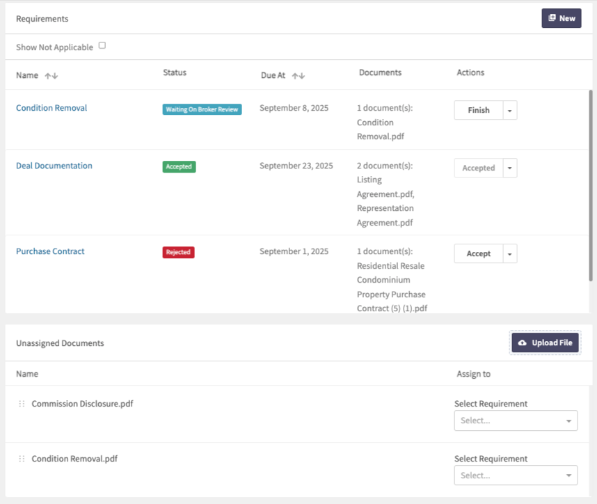 Beyond AI extraction, the feature delivers deep workflow flexibility designed around brokerage realities such as requirement templates that adapt dynamically by deal type, state or province, side, and property type. Relative due dates that calculate automatically before or after key contract milestones. Custom requirement states and color-coding, allowing brokerages to reflect internal review steps such as “Waiting on Broker Approval” and advanced deal filtering and pinned views, which turn the deals page into a live, role based to-do list for administrators and managing brokers.