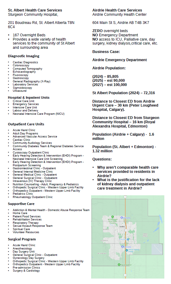 “The population of St. Albert is similar to Airdrie. St. Albert’s Sturgeon Community Hospital provides a broad range of health services. What is the justification for the lack of healthcare services in Airdrie? It clearly is not due to its proximity to Calgary, as St. Albert’s Hospital is only 16 km from the closest hospital in Edmonton (Royal Alexandra), while patients in Airdrie must travel a minimum of 30 km to Calgary’s Peter Lougheed Hospital. The combined population of Calgary + Airdrie is 300,000 greater than Edmonton + St Albert. Thus, with all things being equal, it appears that AHS is inconsistent when determining where to offer health services in the province.”
