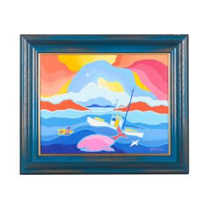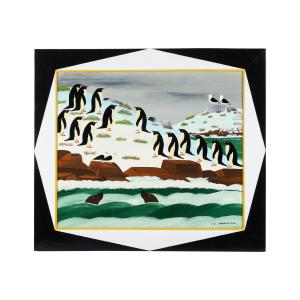 Joe Norris is represented by two strong works that capture his distinctive storytelling approach and vibrant colour. Lot 58, Penguins (estimate $12,000–$15,000 Canadian), dated 1983, presents an imaginative and rarely seen subject, with seals and seabirds observing a colony of penguins on a snow-dusted island. The image closely relates to an example illustrated in Riordon’s Painted Visions of Nova Scotia. Lot 31, Deer Cove (estimate $9,000–$12,000 Canadian), dated 1987, incorporates many of Norris’s signature elements, including bright coastal waters, fishing boats, grazing animals, and a painted songbird frame.