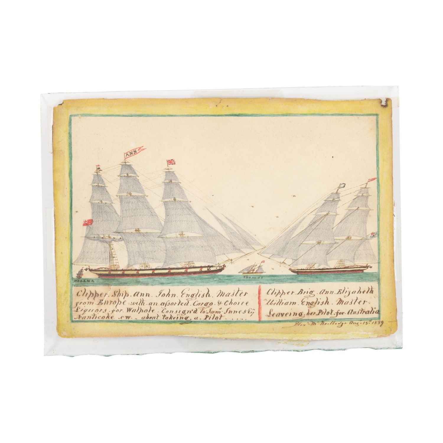 Marine watercolor and ink by famed folk artist Captain Alexander McNeilledge (1791-1874), painted in 1859, small at just 5 ½ inches by 7 ½ inches, minus the frame (CA$24,780).
