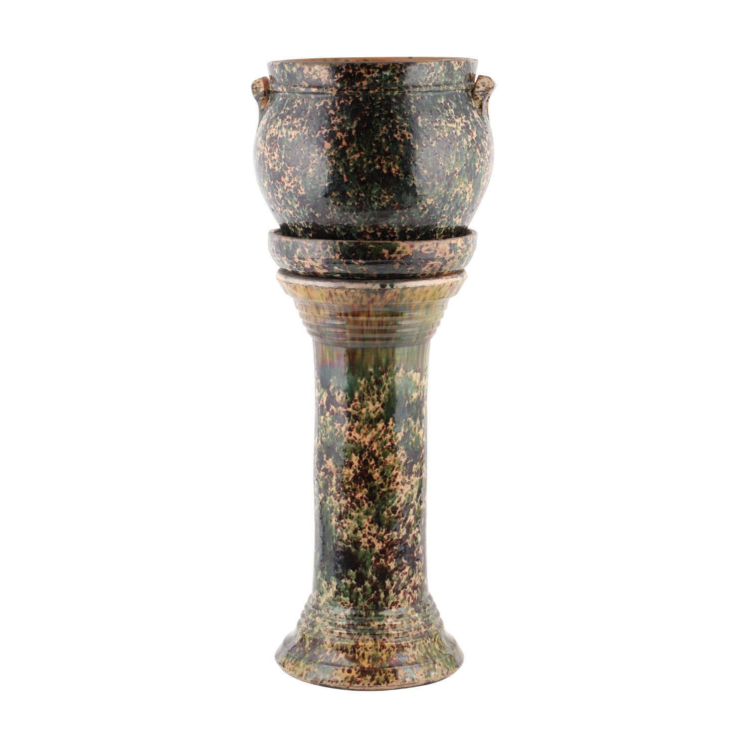 Jacobi Pottery of Waterloo County, Ontario three-piece plant stand, nearly 30 inches tall, having a spectacular glaze with heavy green and brown mottling over a peach color base (CA$8,260).