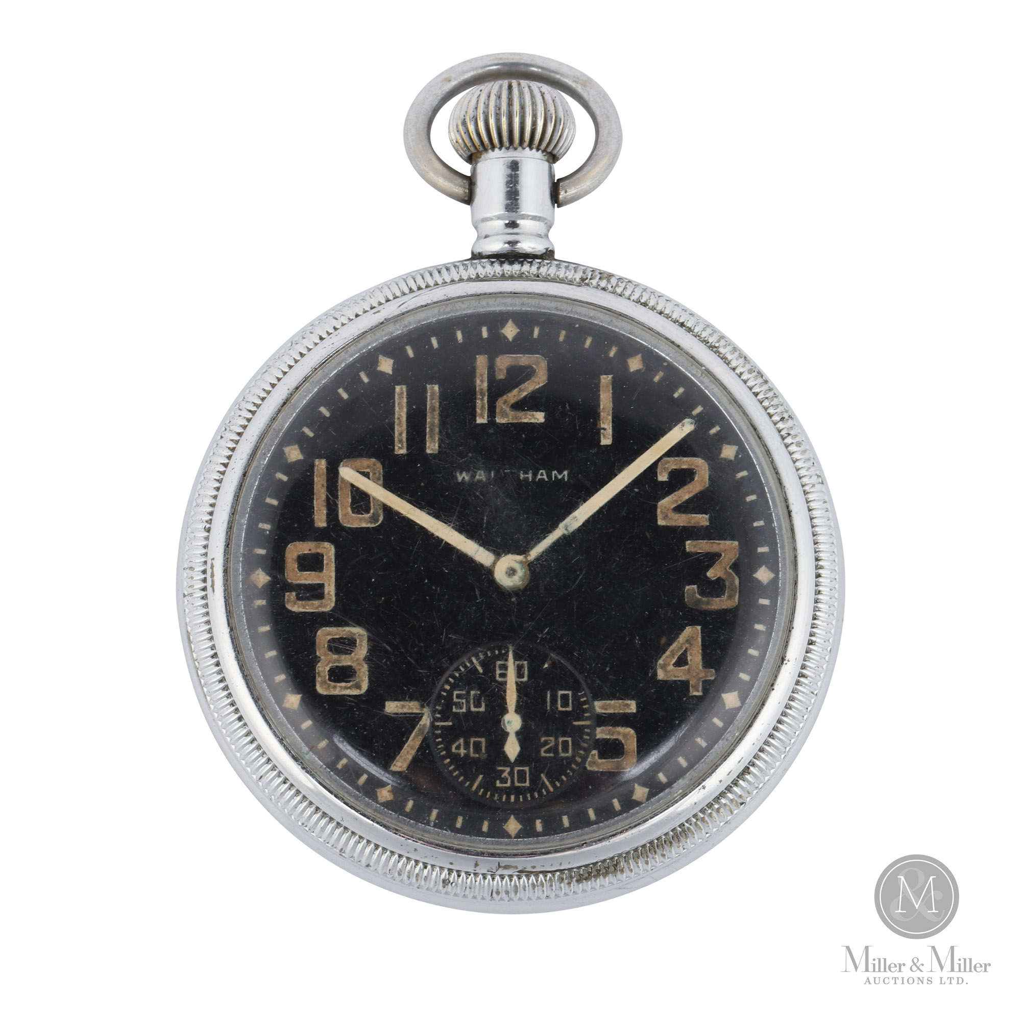 Circa 1942 Waltham pocket watch, 9 jewels, marked with broad arrow military proper marking. These watches were issued to Canadian Snipers during the Second World War. (CA$560)