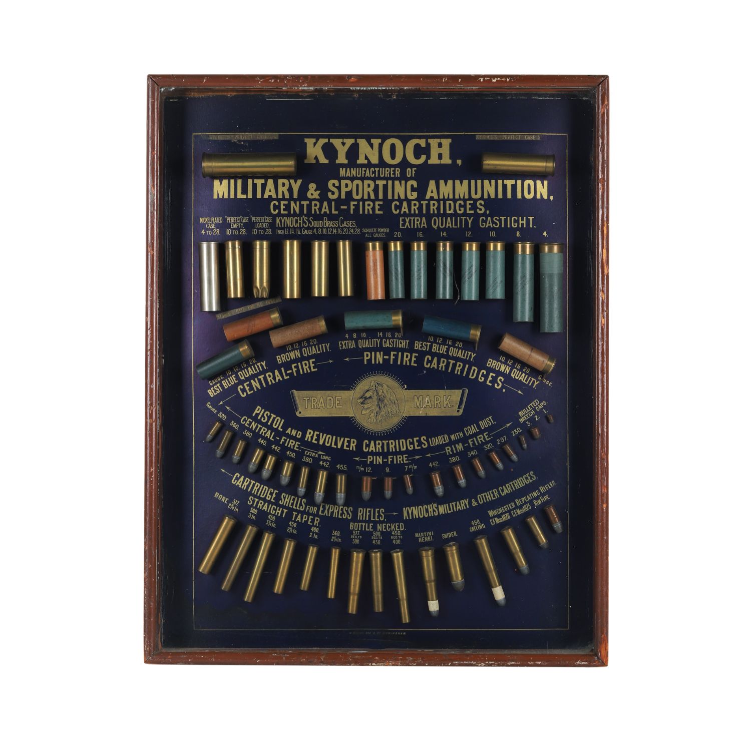 Lot #72 was a British 1880s-era Kynoch Military & Sporting Ammunition cartridge display board, framed behind glass, with the cartridges held onto the backing via bound wire. Measuring 26 inches by 22 inches, this was a seldom seen Kynoch cartridge board with historic Canadian business provenance. It was once mounted at the front counter of G.S. Pinder Gun & Locksmith (later renamed to Pinder Sporting Goods in St. Catherines, Ontario). It left the room for $7,080.