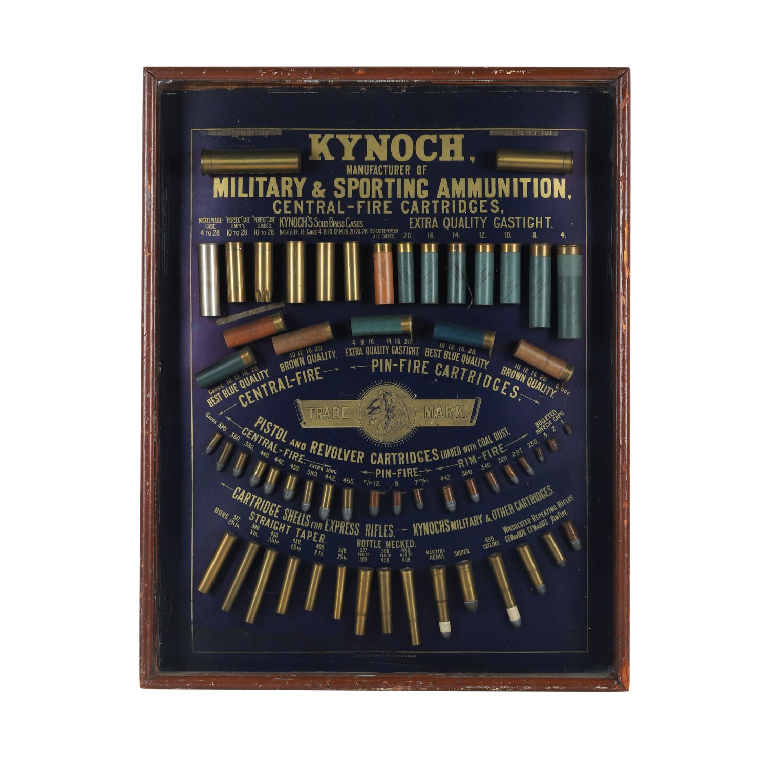 British 1880s-era Kynoch Military & Sporting Ammunition cartridge display board, framed behind glass, the cartridges held onto the backing via bound wire. Estimate: CA$5,500-$6,500.
