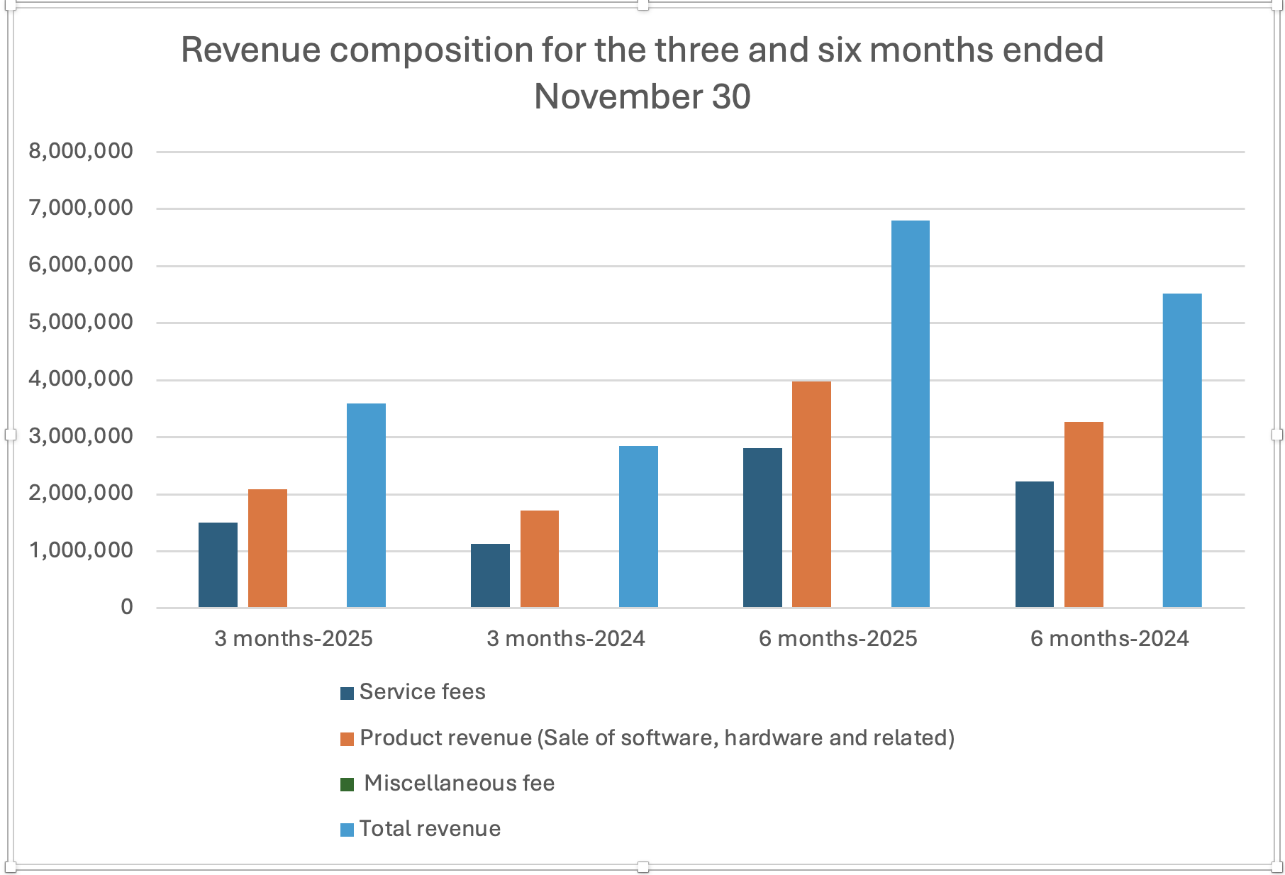 Revenue for the three-month period ended November 30, 2025 reached $3,595,614, representing an increase of $748,059 or 26.3% compared to the same quarter in the prior year. For the six-month period, revenue increased to $6,793,442, up 23.2% from $5,513,834 in the prior year period.