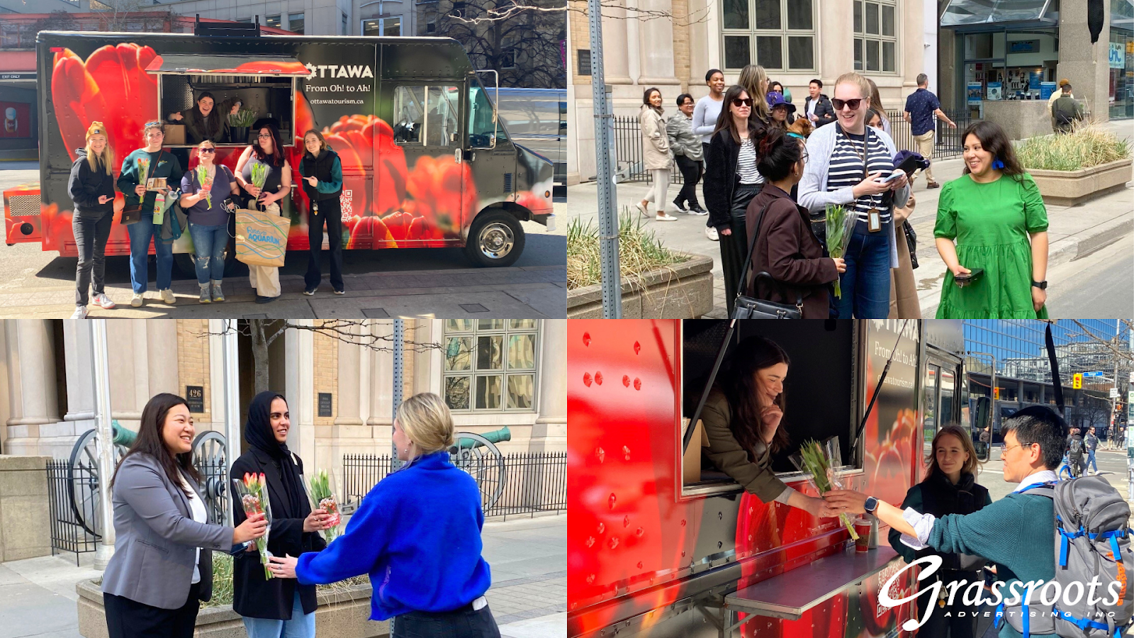 From April 22nd to 26th, the flower truck charmed crowds at key Toronto locations like Union Station, Trinity Bellwoods, Liberty Village, and Maple Leaf Square. Grassroots’ energetic street teams gifted over 12,000 tulips to passersby, each accompanied by an inviting Ottawa Tourism postcard. The teams also shared engaging details about the festival’s history and significance, warmly encouraging Torontonians to visit Ottawa.