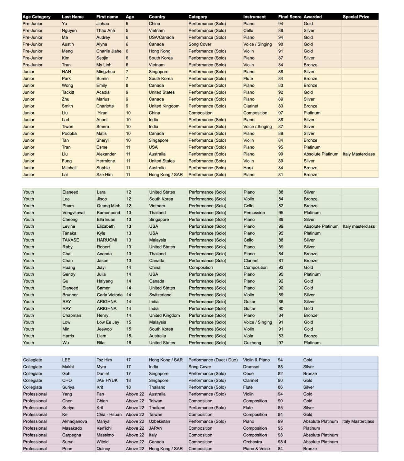 Name Age Country Instrument / Category Score Award