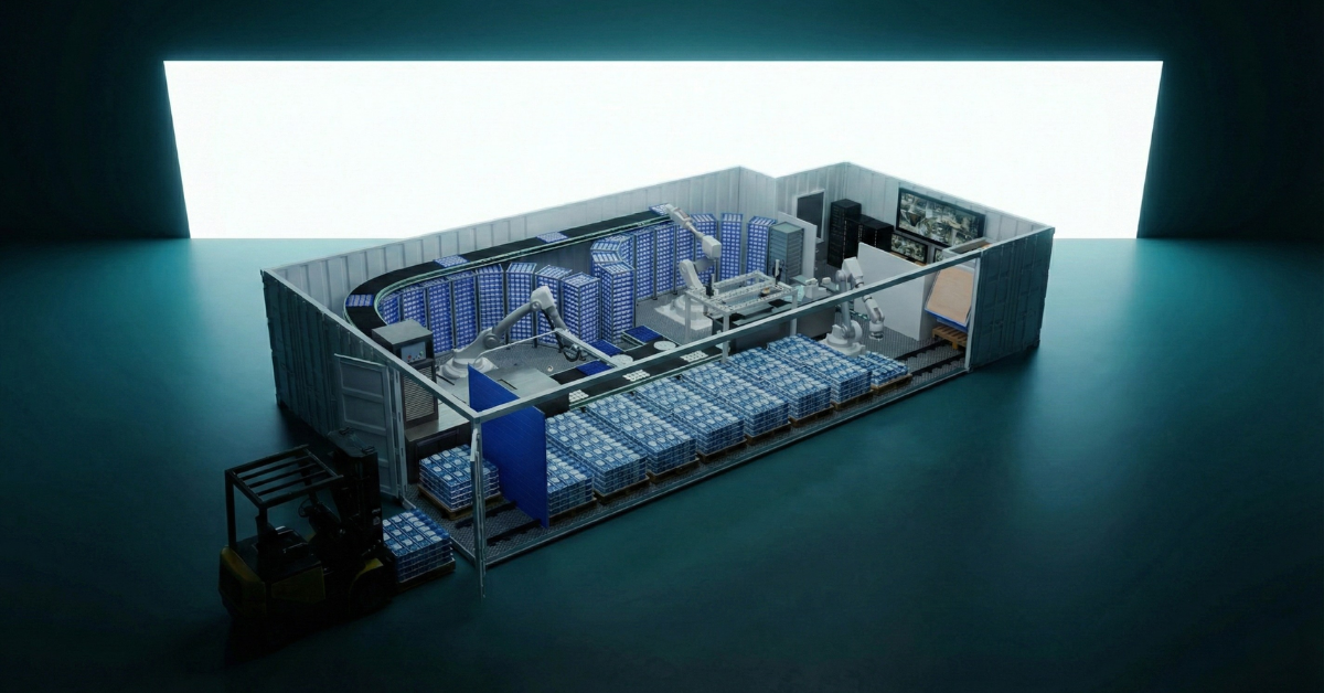 Vue extérieure de Relo, la micro-usine de Relocalize, un système modulaire en conteneurs conçu pour la fabrication distribuée de packs de froid à base d’eau et sacs de glace emballés.