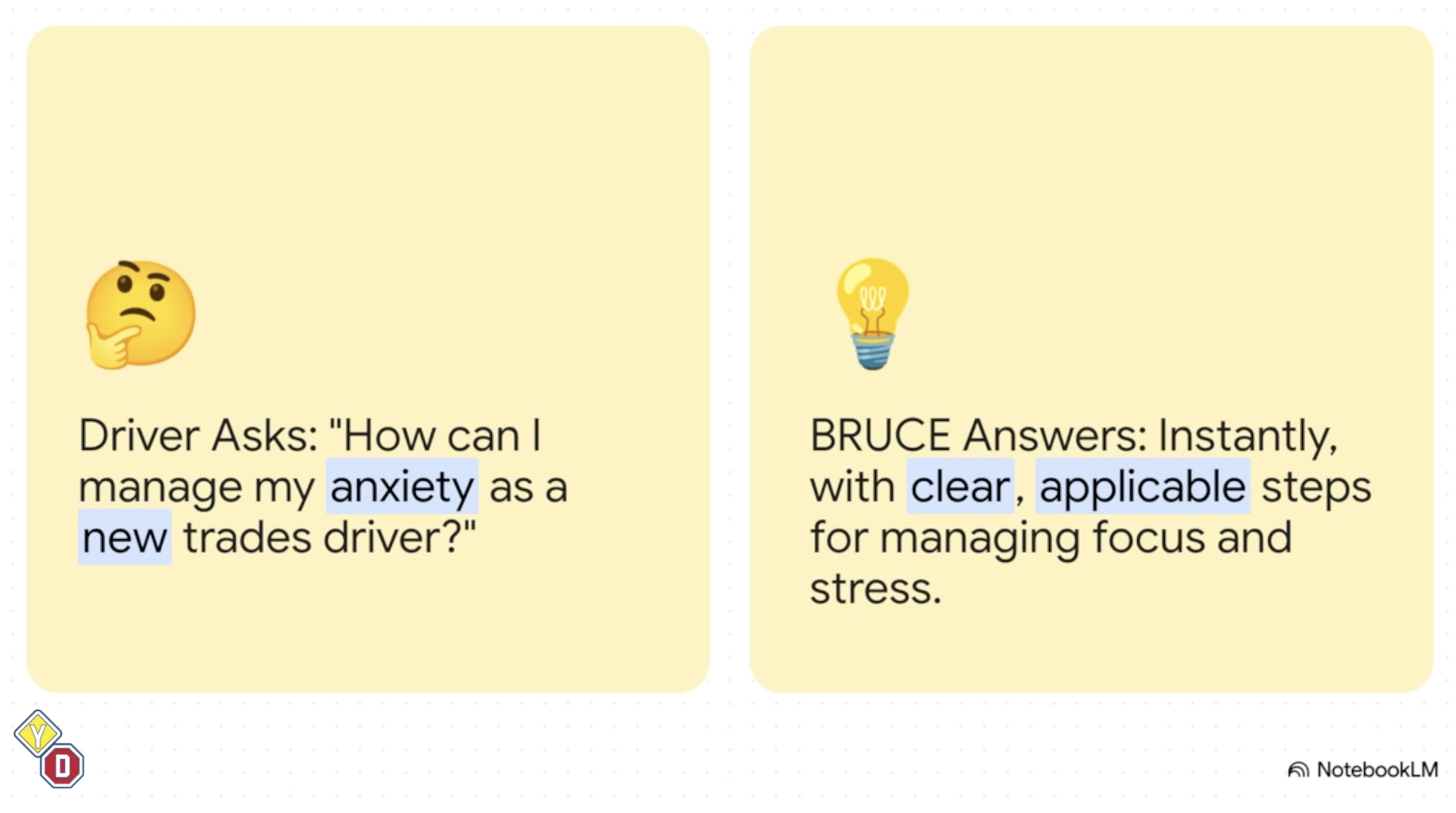 Embedded throughout the course, BRUCE uses conversational AI to improve comprehension and retention. Learners can ask natural-language questions such as: “How should I adjust my following distance when carrying a heavier or uneven load?” or “How can I manage my anxiety as a new trades driver?” BRUCE responds instantly with clear, applicable steps – ensuring consistent, expert-level instruction across all crews and regions. Supervisors can benefit from standardized, data-informed coaching, while drivers gain confidence and real-time access to best practices.